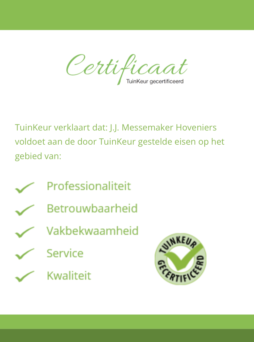 J.J. Messemaker Hoveniers staat voor kwaliteit, daarom hebben wij ons bedrijf TuinKeur gecertificeerd. Wij vinden, met onze vakkennis en passie voor het hoveniersvak, vak dat wij onze klanten moeten voorzien van extra betrouwbaarheid. Naast betrouwbaarheid biedt een TuinKeur-hovenier meer.