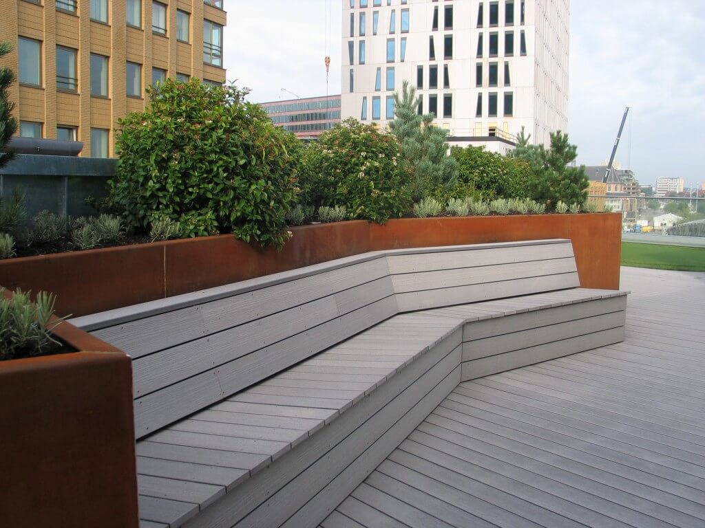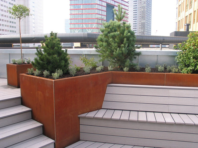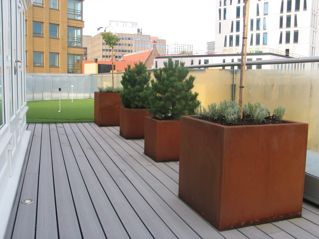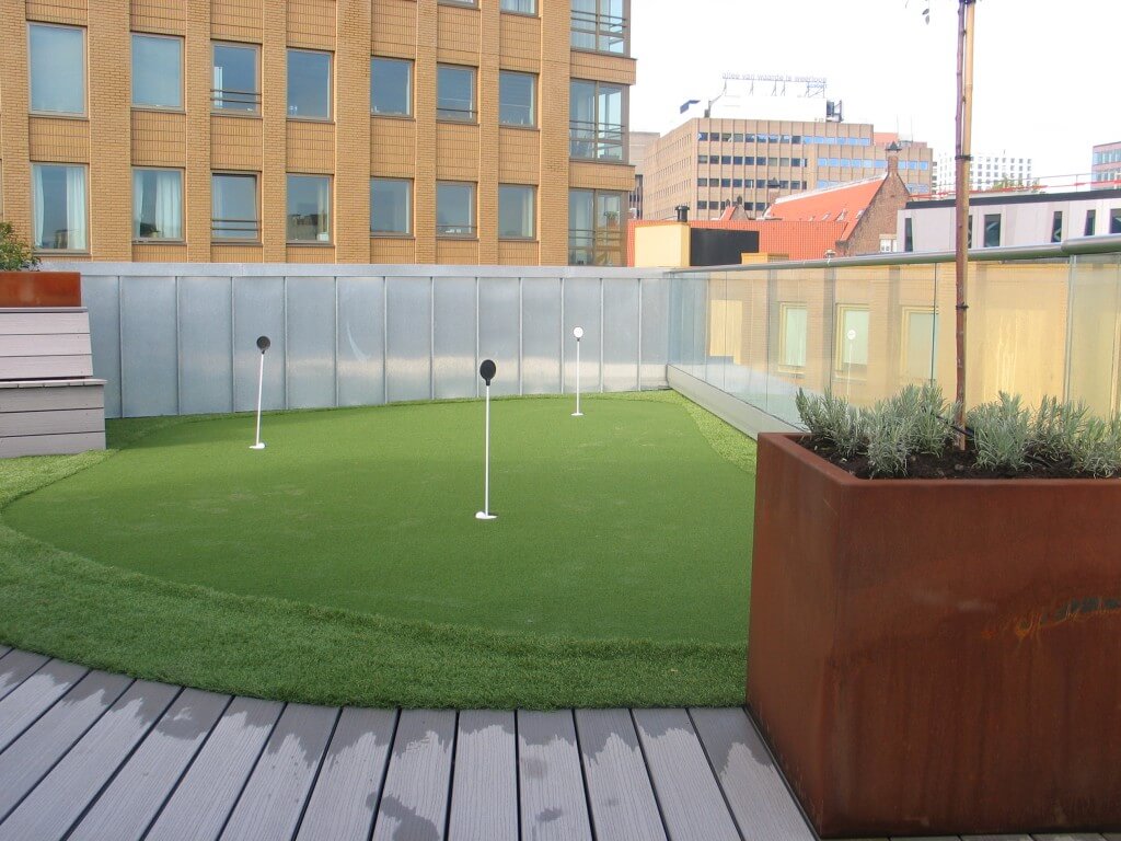 Strakke daktuin met gebruikmaking van Corténstaal en Fiberon composiet planken. Én een kleine putting green op eenzame hoogte… Ontwerp: Tuinarchitectenburo Arend Jan van der Horst.
